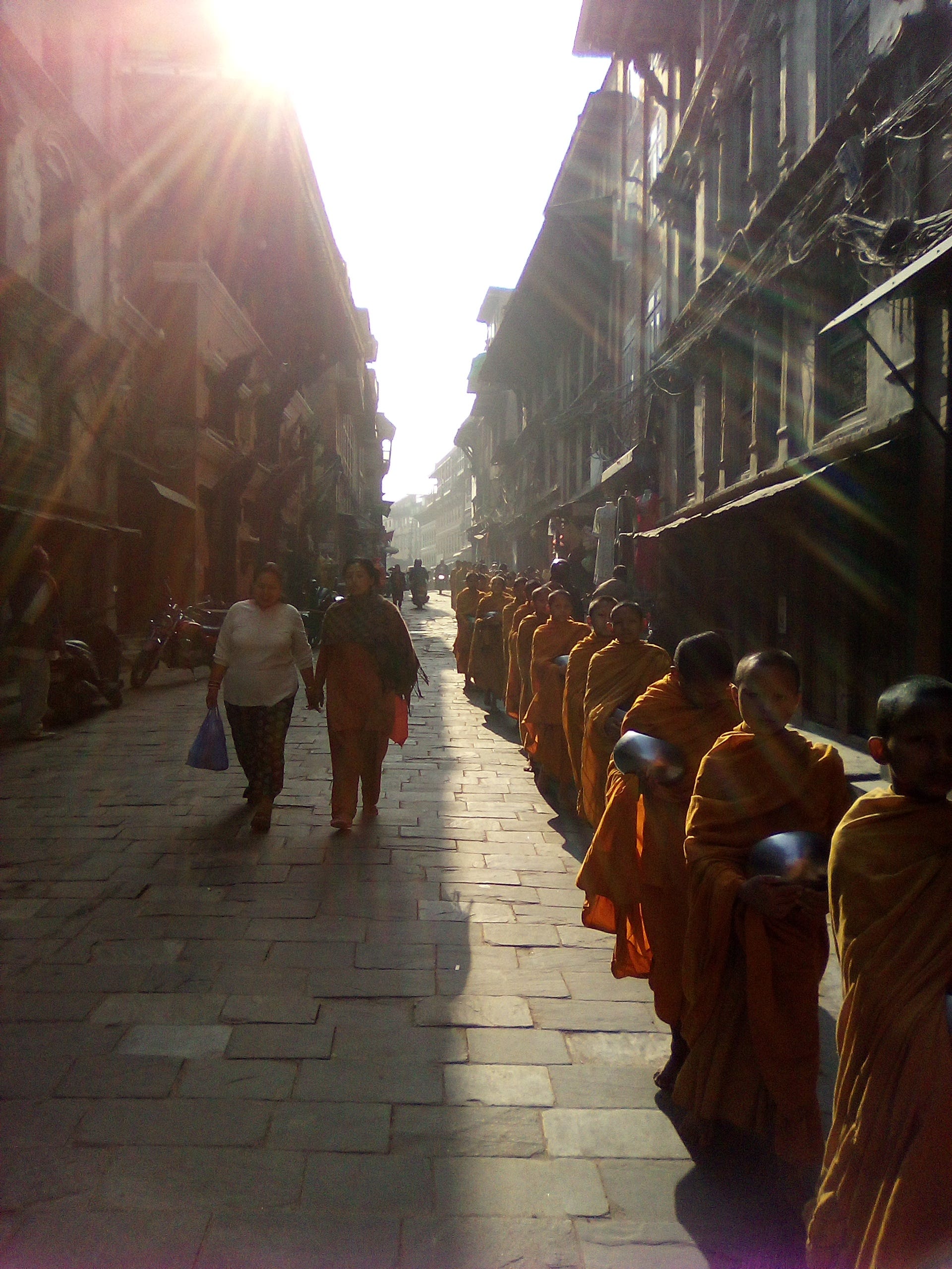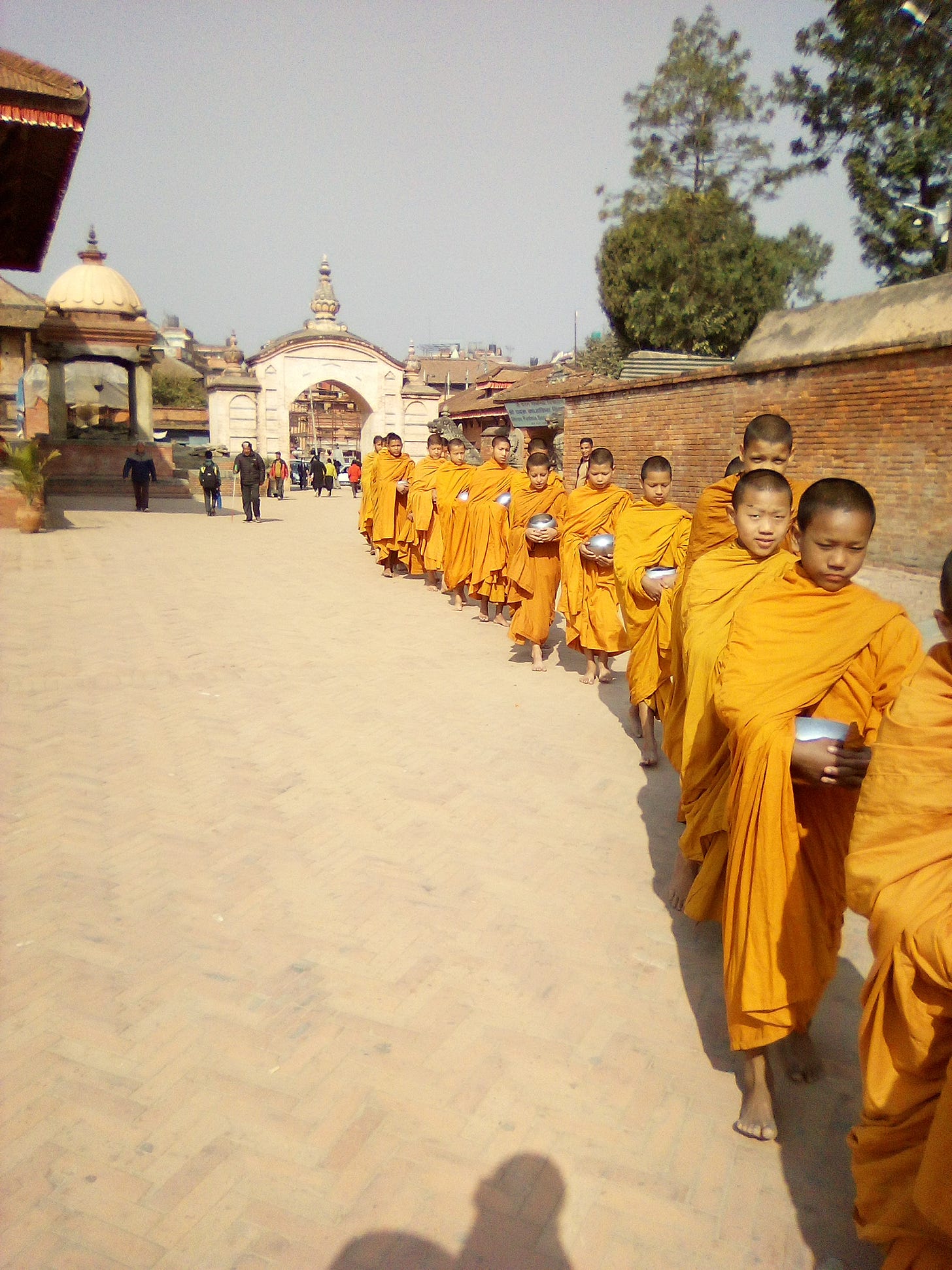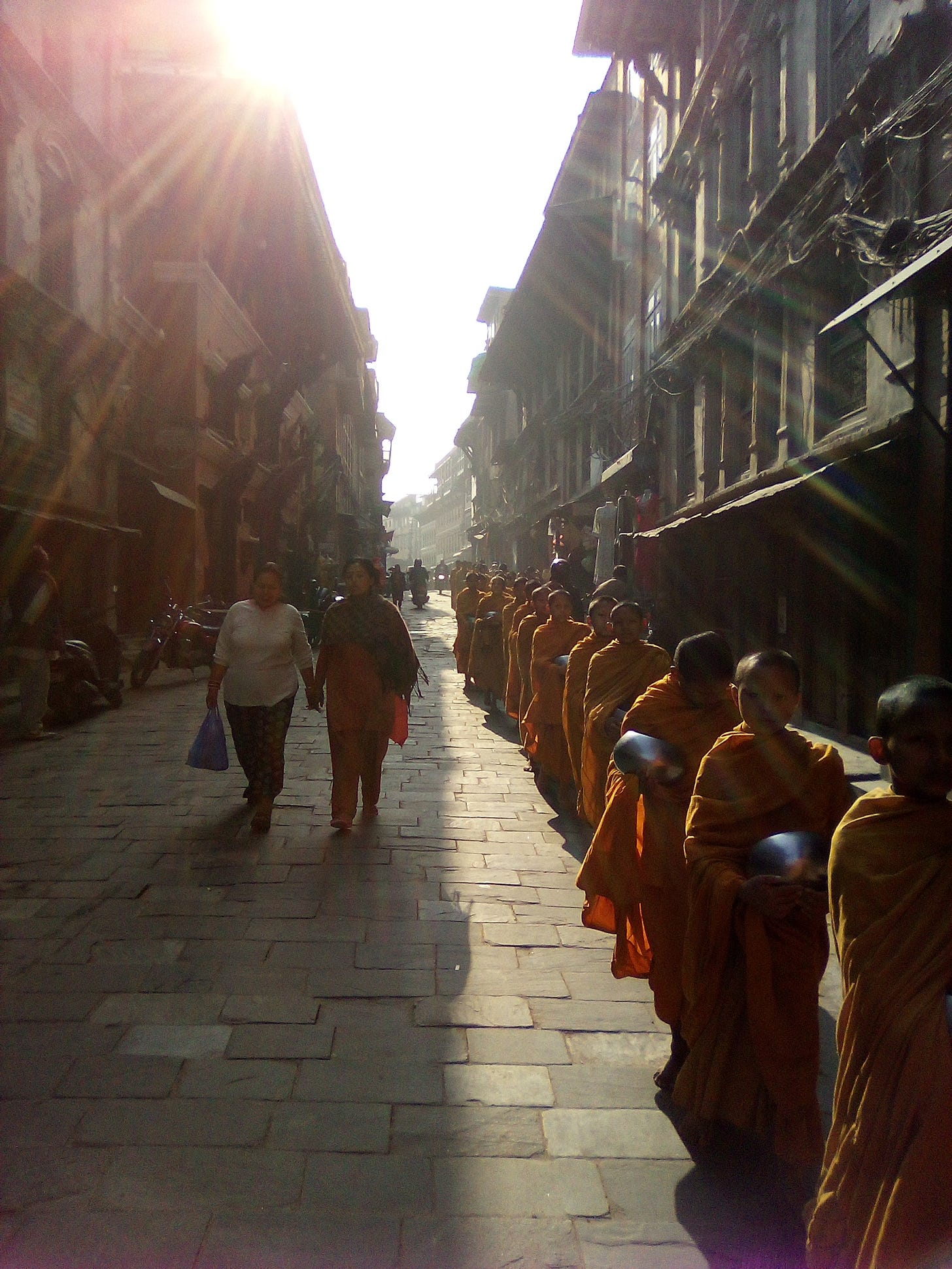 七十个沙弥们赤脚走过巴克塔普尔古城,领先的帮助者背着一个扩音器,回放着著名的印度式“佛陀三皈依”庇护咒语,在巴克塔普尔的街道、广场和神庙中回荡。