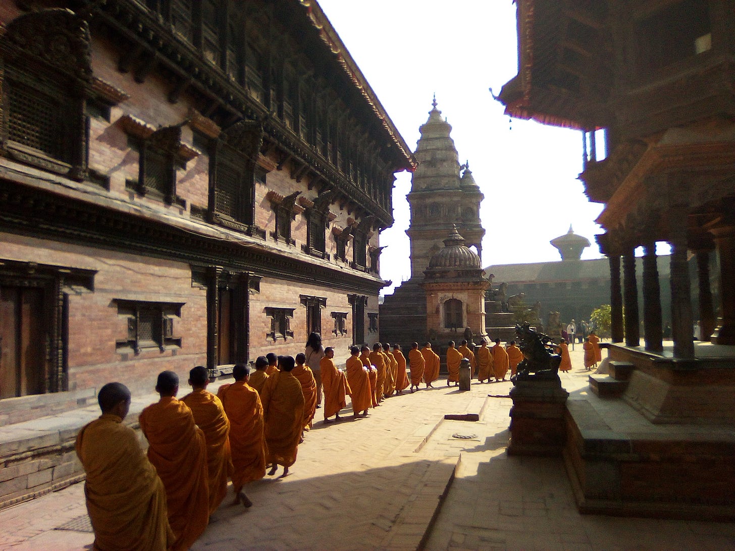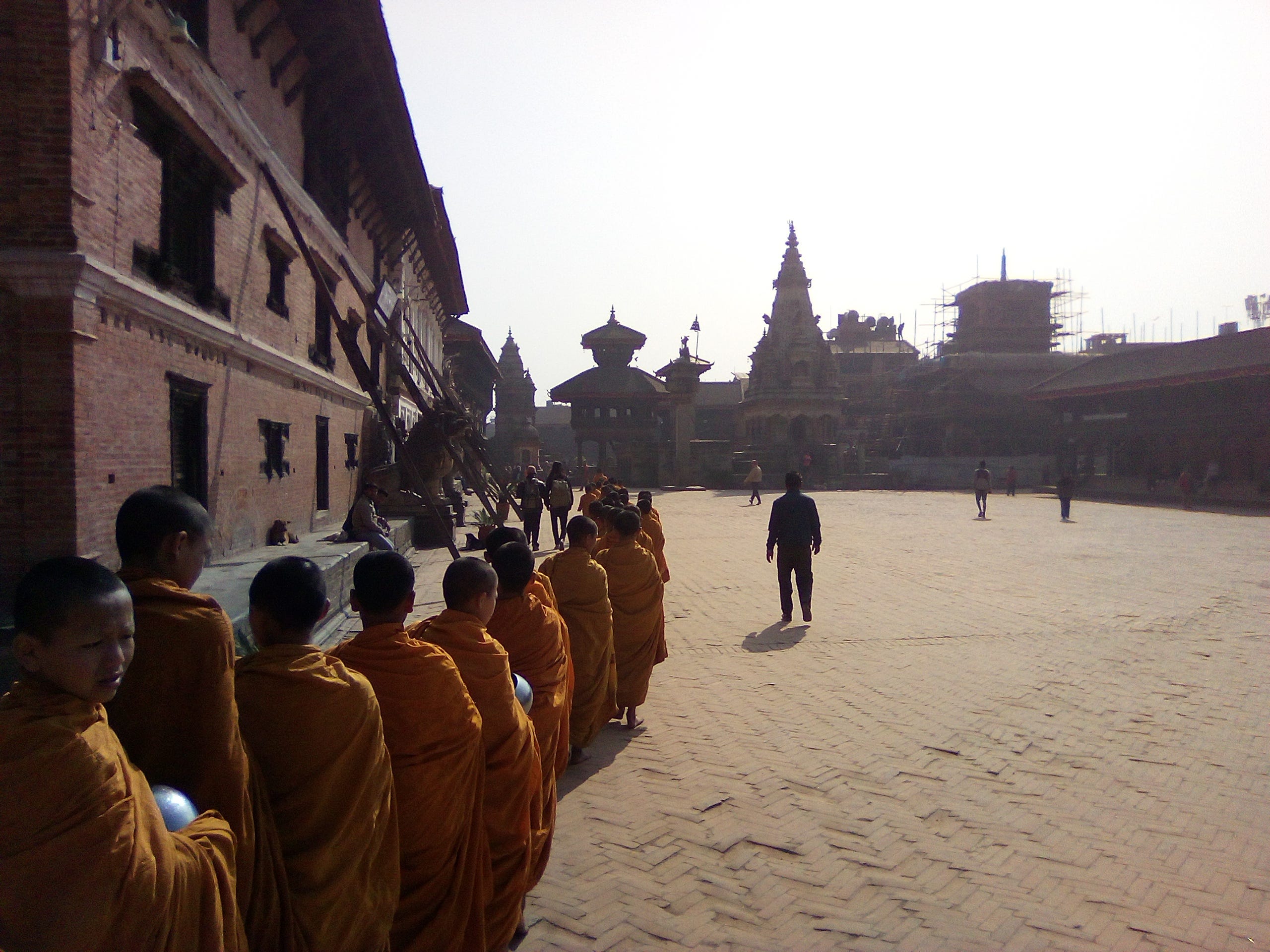 这真是值得的,广场中心挤满了游客,感觉就像在阿育王的时代行走托钵行一样。在售票亭,他们不得不说服工作人员,寺院会后付费,这让一排排可怜的沙弥们站在烈日下等待15分钟,直到票务问题最终解决,他们才让我进入广场。里面,我们走进了小的神龛庭院和小巷,当然我们的视线是所有业余的西方游客摄影师的滋养食品,幸运的是他们的镜头和 Instagram 页面上都有这个壮观的景象:佛教沙弥们在巴克塔普尔古城中心行走,在他们更古老的托钵行走行动中。